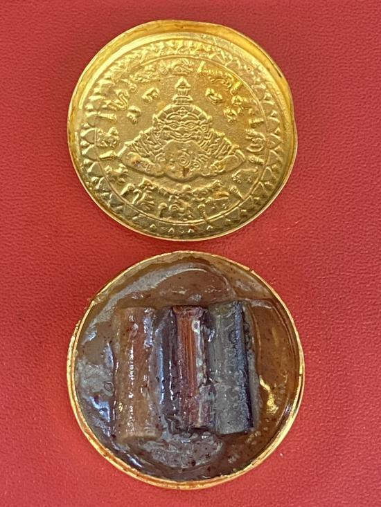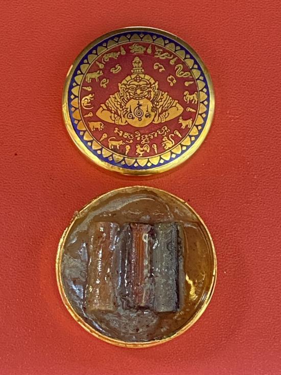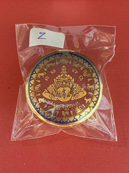 เคาะเดียวแดง สีผึ้งพระราหู รุ่น มงคลจักรวาล เนื้อ โลหะชุบทองลงยาสีแดงขอบสีน้ำเงิน ขนาด3.2ซม |