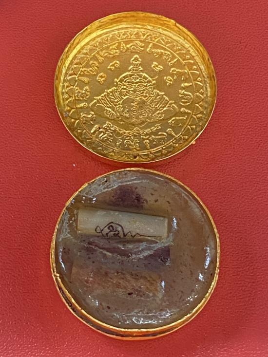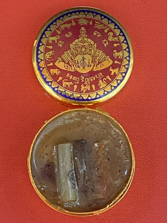 เคาะเดียวแดง สีผึ้งพระราหู รุ่น มงคลจักรวาล เนื้อ โลหะชุบทองลงยาสีแดงขอบสีน้ำเงิน ขนาด3.2ซม |