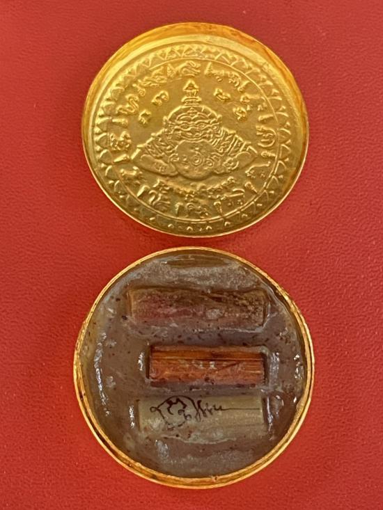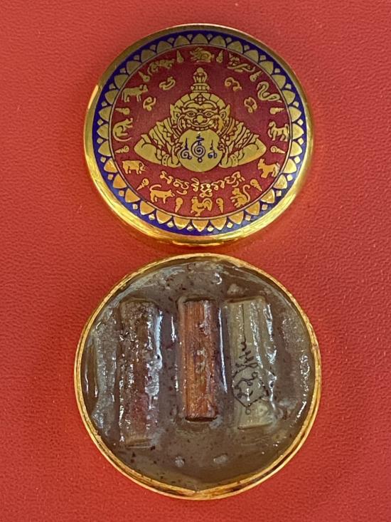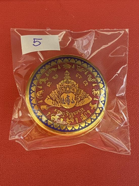 เคาะเดียวแดง สีผึ้งพระราหู รุ่น มงคลจักรวาล เนื้อ โลหะชุบทองลงยาสีแดงขอบสีน้ำเงิน ขนาด3.2ซม |