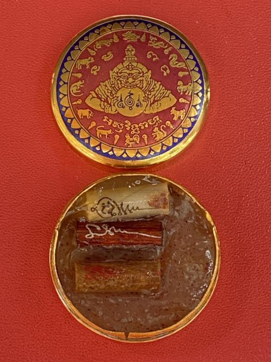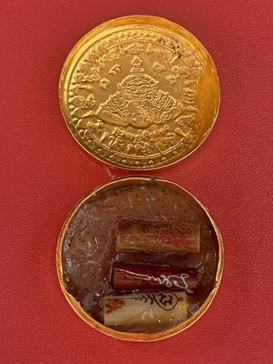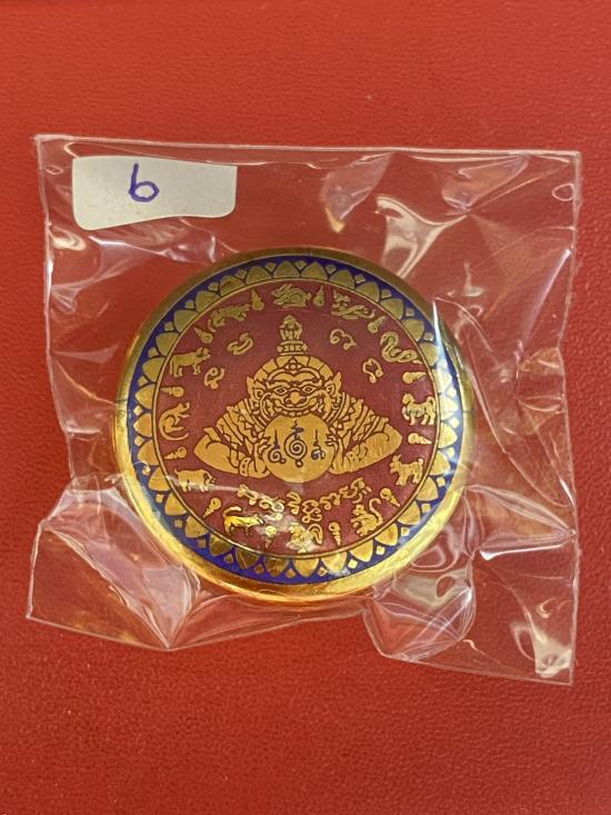 เคาะเดียวแดง สีผึ้งพระราหู รุ่น มงคลจักรวาล เนื้อ โลหะชุบทองลงยาสีแดงขอบสีน้ำเงิน ขนาด3.2ซม |