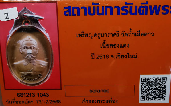 เหรียญครูบาราศรี วัดถ้ำเสือดาว เนื้อทองแดง ปี2518 จ.เชียงใหม่ + บัตรG-pra สภาพเดิมค่ะ
