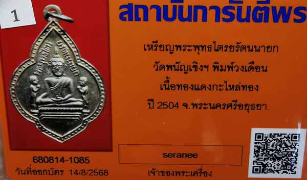 เหรียญพระพุทธไตรยรัตนนายก วัดพนัญเชิงฯ พิมพ์หลังวงเดือน เนื้อทองแดงกะไหล่ทอง ห่วงเดิม ปี2504 จ.พระนครศรีอยุธยา + บัตรG-pra สภาพสวยสวยเลยค่ะ