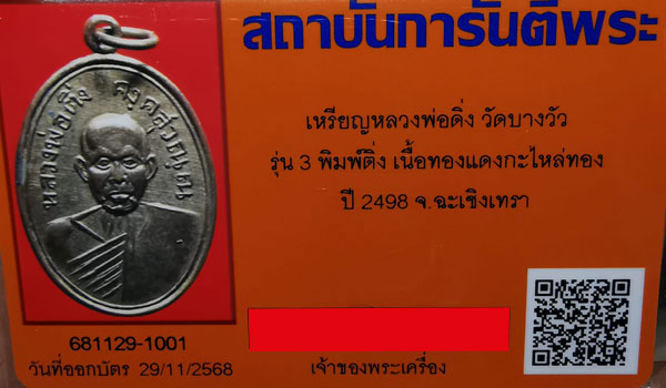 เหรียญหลวงพ่อดิ่ง วัดบางวัว รุ่น3 พิมพ์ติ่ง เนื้อทองแดงกะไหล่ทอง ห่วงเดิม ปี2498 จ.ฉะเชิงเทรา + บัตรG-pra สภาพเดิมค่ะ สภาพตามรูปทุกประการค่ะ