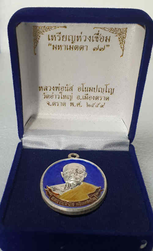 หมายเลขสวยตอง ๒๒๒ เนื้อเงินลงยา เหรียญห่วงเชื่อมรุ่นแรก หลวงพ่อนัส วัดอ่าวใหญ่ ตราด ปี 58 พร้อมกล่องกำมะหยี่เดิม