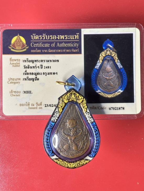 เหรียญดวงตรามหาเดช(พญาครุฑ) ท่านเจ้าคุณทักษิณ วัดอินทาราม ตลาดพลู ปี2482 สุดยอดหายาก