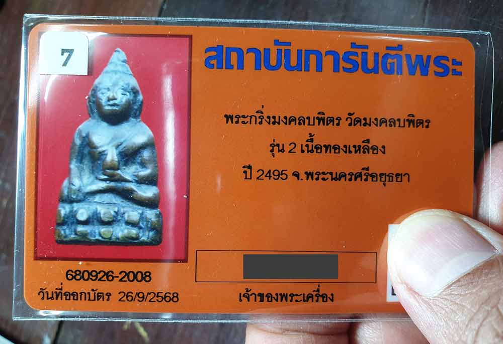 กริ่งมงคลบพิตร วัดมงคลบพิตร รุ่น 2 เนื้อทองเหลือง ปี 2495 จ.พระนครศรีอยุธยา เลี่ยมกันน้ำพร้อมบูชา เคาะเดียวแดง 2,000 บาท