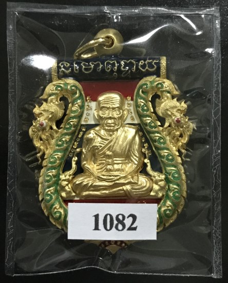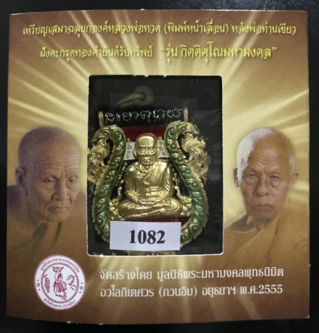 "วัดใจ" เหรียญเสมาฉลุยกองค์หลวงพ่อทวด(พิมพ์หน้าเลื่อน)หลังพ่อท่านเขียว ฝังตะกรุดทองคำยันต์รับทรัพย์ "รุ่น กิตติคุโณมหามงคล" เนื้อบรอนซ์ชุบทอง ลงยาซุ้มพญานาคฉากสีธงชาติ สภาพสวยเดิมเลี่ยมกันน้ำรักษาผิว พร้อมกล่องเดิม หมายเลข 1082