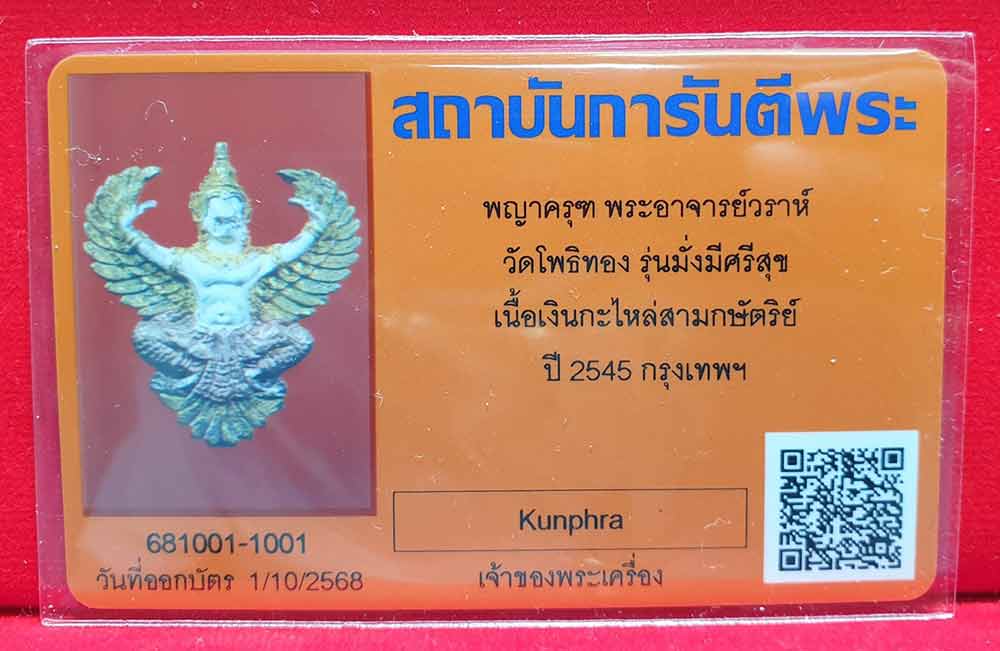 ชื่อพระเครื่อง พญาครุฑ พระอาจารย์วราห์ วัดโพธิทอง รุ่นมั่งมีศรีสุข เนื้อเงินกระไหล่สามกษัตริย์ ปี 2545 กรุงเทพฯ เคาะเดียวแดง 2,000