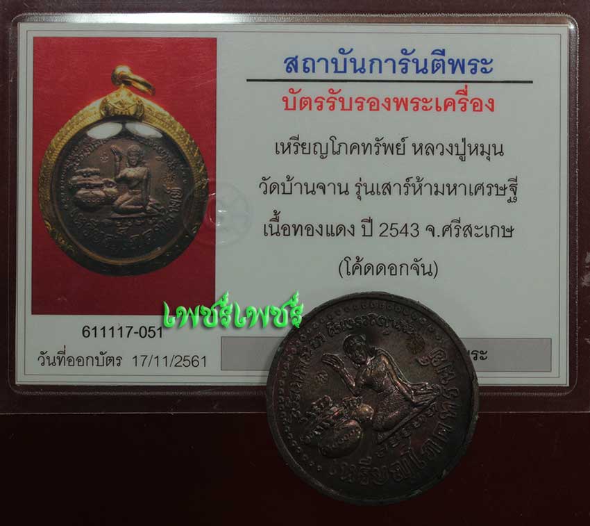 เหรียญโภคทรัพย์ หลวงปู่หมุน วัดบ้านจาน รุ่นเสาร์ห้ามหาเศรษฐี โค๊ตดอกจัน2โค๊ต นิยม เนื้ิอทองแดง ปี2543 จ.ศรีสะเกษ สภาพสวยเดิมๆผิวยังมีเห็นตามซอก ไม่ผ่านการใช้ หายาก พร้อมบัตรรับรองพระแท้จากจีพระสบายใจได้พระแท้แน่นอน ค่ะ