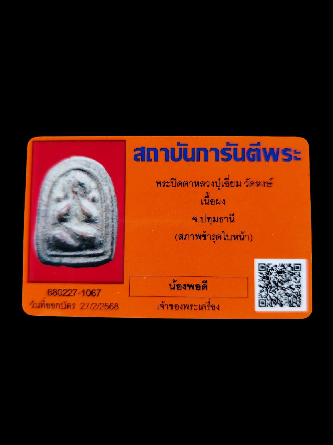 พระปิดตาหลวงปู่เอี่ยมวัดหงษ์ ชำรุดใบหน้า มาพร้อมบัตรรับรอง