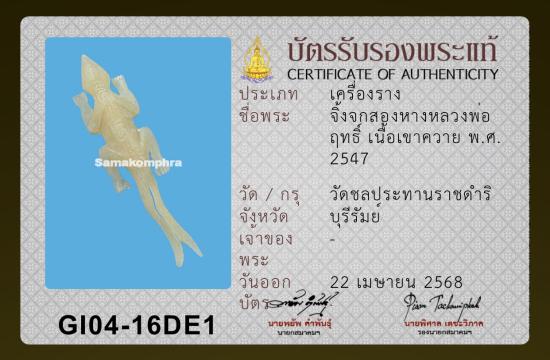 ชื่อพระเครื่อง จิ้งจกสองหางหลวงพ่อฤทธิ์ วัดชลประทานราชดำริ เนื้อเขาควาย ปี 2547 พร้อมบัตรรับรองสมาคม