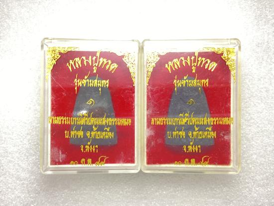 เคาะเดียวแดง 100 ( 2 องค์) หลวงปู่ทวด รุ่นข้ามสมุทร 1 สถานธรรมลานธรรมบารมีศรีปทุมฯ อ.ท้ายเหมือง พังงา พ. ศ. 2549 เนื้อว่าน กล่องเดิม