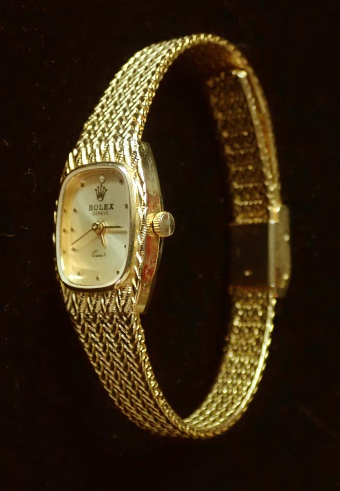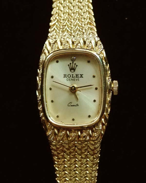 นาฬิกาสุภาพสตรี ยี่ห้อ "ROLEX" งานเก๊เก่า ระบบ QUARTZ สายโลหะถักลาย ชุบทอง วินเทจ สวย...สมบูรณ์ ใช้งานได้ตามปกติ |