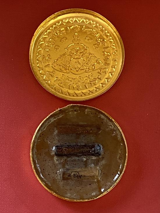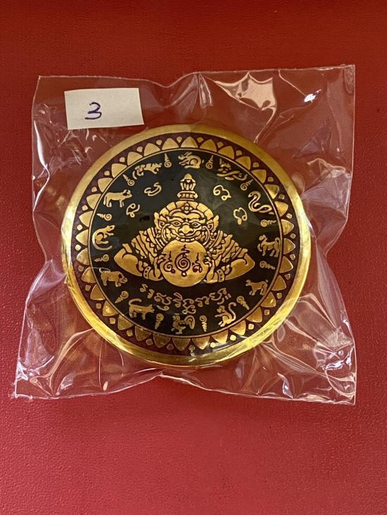 เคาะเดียวแดง สีผึ้งพระราหู รุ่น มงคลจักรวาล เนื้อ โลหะชุบทองลงยาสีดำขอบสีแดง ขนาด5ซม |
