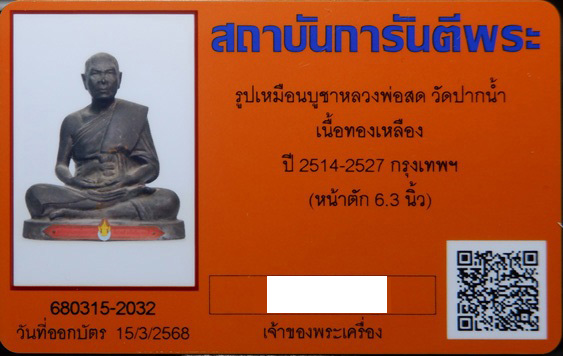 ชื่อพระเครื่อง พระบูชา(ป้ายแดง) หลวงพ่อสด วัดปากน้ำ ภาษีเจริญ ธนบุรี หน้าตัก 6.3" สร้างปี 2514 **หายาก** บัตรรับรอง G-Pra