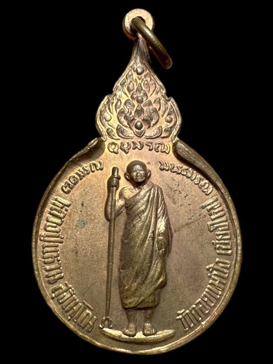 เหรียญยืนหลังพระปรมาภิไธยย่อ ภ.ป.ร. หลวงปู่แหวน สุจิณฺโณ วัดดอยแม่ปั๋ง อ.พร้าว จ.เชียงใหม่ ปี2519 เนื้อทองแดงผิวไฟ |