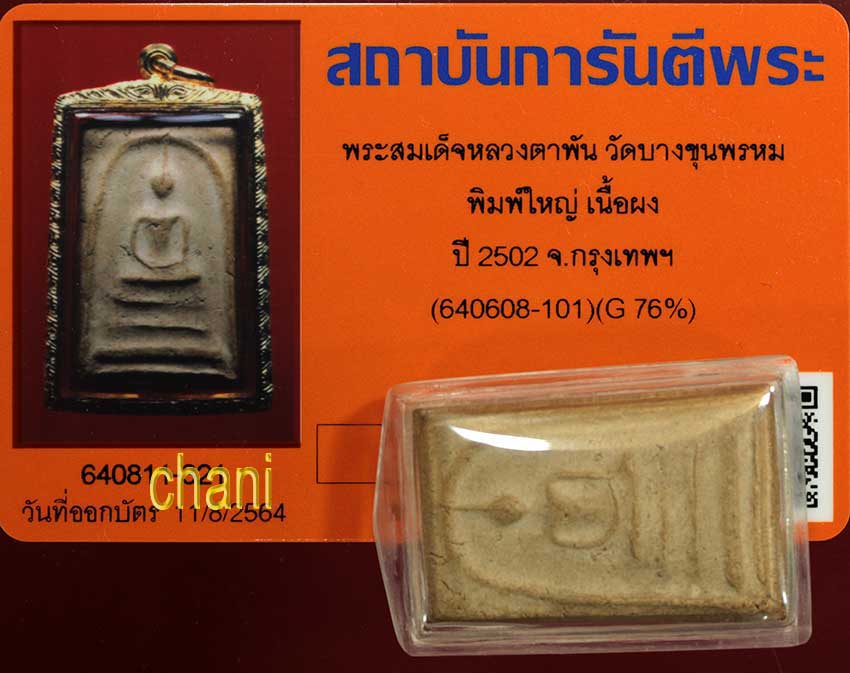 พระสมเด็จหลวงตาพัน วัดบางขุนพรหม พิมพ์ใหญ่ไหล่ยก นิยม เนื้อผง ปี2502 จ.กรุงเทพฯ สภาพสวยๆระดับประกวด พร้อมบัตรรับรองพระแท้จากจีพระอุ่นใจได้ ไม่ต้องลุ้นค่ะ |