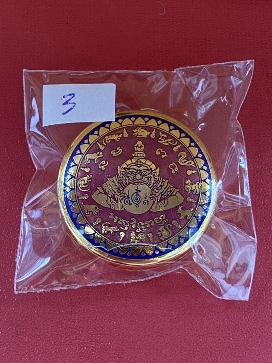 เคาะเดียวแดง สีผึ้งพระราหู รุ่น มงคลจักรวาล เนื้อ โลหะชุบทองลงยาสีแดงขอบสีน้ำเงิน ขนาด3.2ซม |