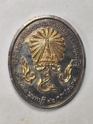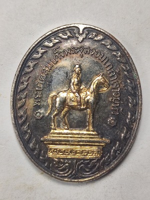 รายละเอียด เหรียญกะไหล่นิเกิ้ลหน้าทอง พระบาทสมเด็จพระจุลจอมเกล้าเจ้าอยู่หัว (พระบรมรูปทรงม้า) ที่ระลึกในงานครบรอบอายุ หลวงพ่อศรีนวล วัดเพลง จังหวัดนนทบุรี สร้างปี 2538