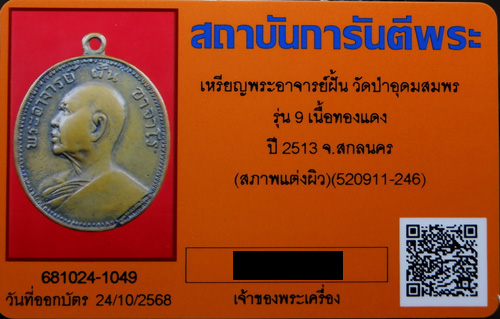 ชื่อพระเครื่อง เหรียญอาจารย์ฝั้น รุ่นยอดนิยม รุ่น 9 ("งามเอก" พิมพ์ลึก) ปี 2513 จ.สกลนคร บัตรรับรอง G-Pra
