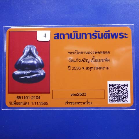 พระปิดตา หลวงพ่อหยอด เนื้อเมฆพัด วัดแก้วเจริญ ปี2537 พร้อมบัตรรับรอง GPra