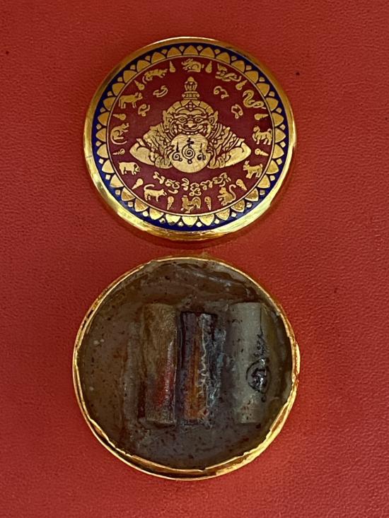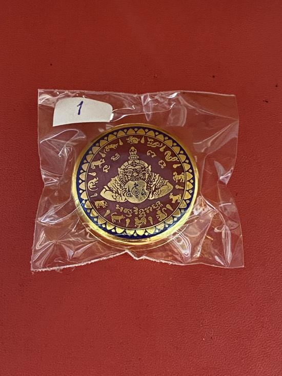 เคาะเดียวแดง สีผึ้งพระราหู รุ่น มงคลจักรวาล เนื้อ โลหะชุบทองลงยาสีแดงขอบสีน้ำเงิน ขนาด3.2ซม |
