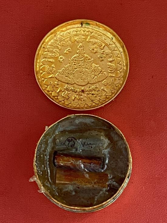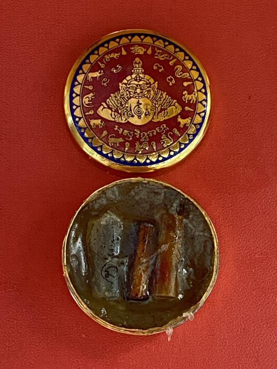 เคาะเดียวแดง สีผึ้งพระราหู รุ่น มงคลจักรวาล เนื้อ โลหะชุบทองลงยาสีแดงขอบสีน้ำเงิน ขนาด3.2ซม |