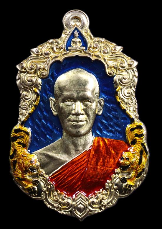 เหรียญเสมาเสือคู่มหาบารมี รุ่น รวย นะ 9 ดี (พระอาจารย์ต้อม วัดท่าสะแบง จ.ร้อยเอ็ด) เนื้อทองระฆัง ลงยาสีน้ำเงิน ลงยาเสือ จมูกร้อย หมายเลข 206 กล่องเดิม