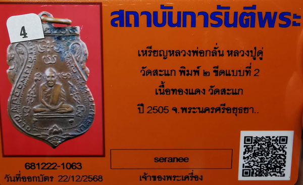 เหรียญหลวงพ่อกลั่น หลวงปู่ดู่ วัดสะแก เนื้อทองแดง ห่วงเดิม ปี2505 จ.พระนครศรีอยุธยา + บัตรG-pra สภาพเดิมค่ะ |
