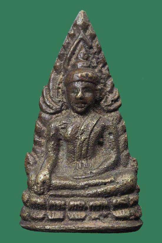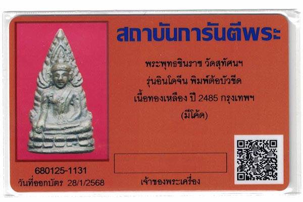 พระพุทธชินราช วัดสุทัศนฯ รุ่นอินโดจีน พิมพ์ต้อบัวขีด เนื้อทองเหลือง ปี 2485 กรุงเทพฯ (มีโค้ด) พร้อมบัตรรับรอง