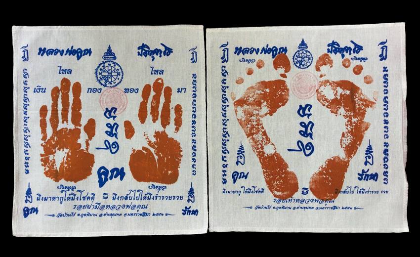 +!!เคาะเดียวllดง ตลอดสาย!!+ (รับคู่ 2 ผืน) ผ้ายันต์ รอยมือ รอยเท้า หลวงพ่อคูณ วัดบ้านไร่ ปี51 ขนาด 28x30 ซม. ทำจากผ้าดิบอย่างดี ปั้มตราวัด สวยเดิมๆเลยครับ