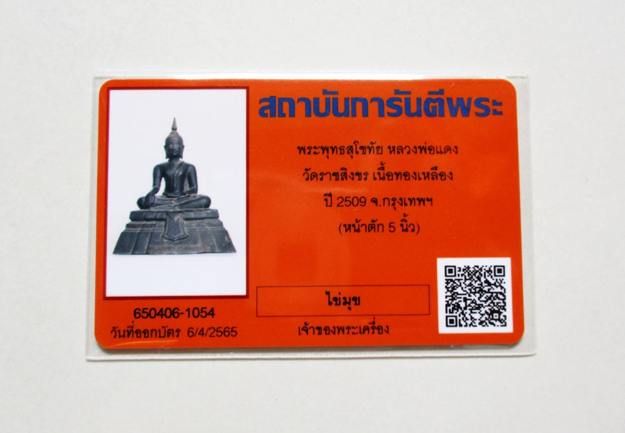 พระพทุธสุโขทัย หลวงพ่อแดง วัดราชสิงขร จ.กรุงเทพฯ รุ่นแรก พ.ศ.2509 หน้าตัก 5 นิ้ว เนื้อโลหะทองเหลืองหล่อดินไทย ผิวหิ้ง พร้อมบัตรรับรองพระแท้การันตีพระ !! |