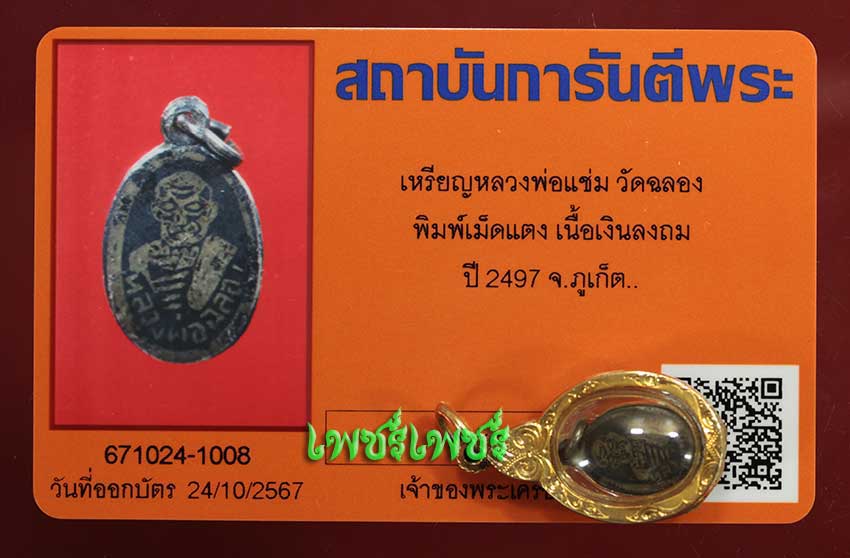 เหรียญ หลวงพ่อแช่ม วัดฉลอง พิมพ์เม็ดแตง เนื้อเงินลงถม ปี2497 จ.ภูเก็ต สภาพสวยคมชัด เก่าเดิมๆตามอายุหายาก เลี่ยมทองพร้อมใช้ พร้อมบัตรรับรองพระแท้จากการันตีพระสบายใจได้พระแท้แน่นอน ค่ะ