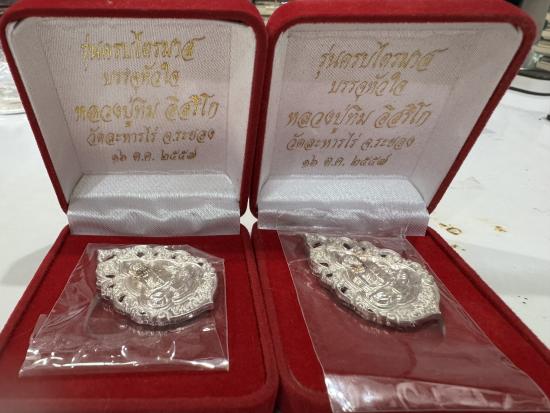 เหรียญฉลุ รุ่นครบไตรมาส บรรจุหัวใจ ปี2557 เนื้อเงิน มีกล่องครบ จำนวน 2 เหรียญ