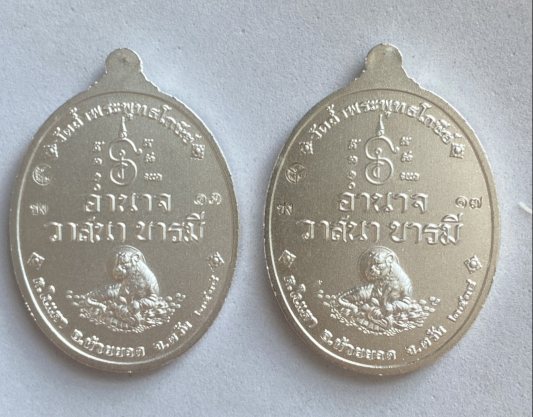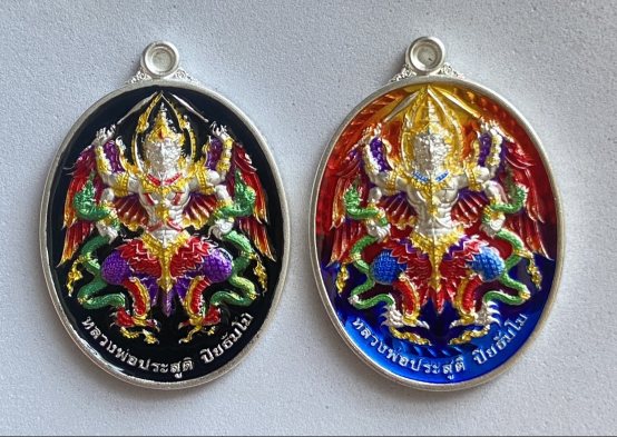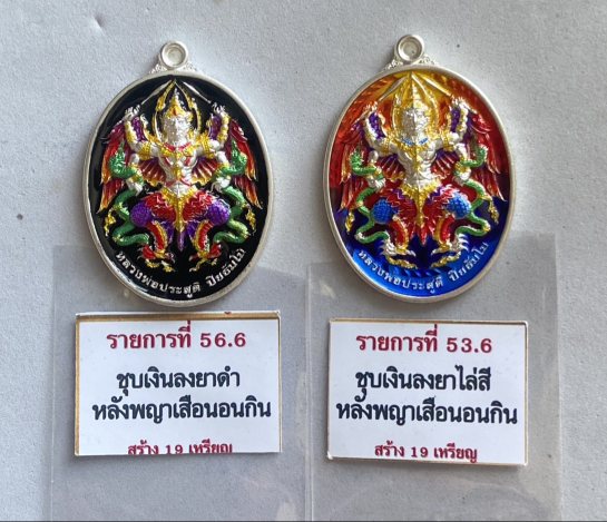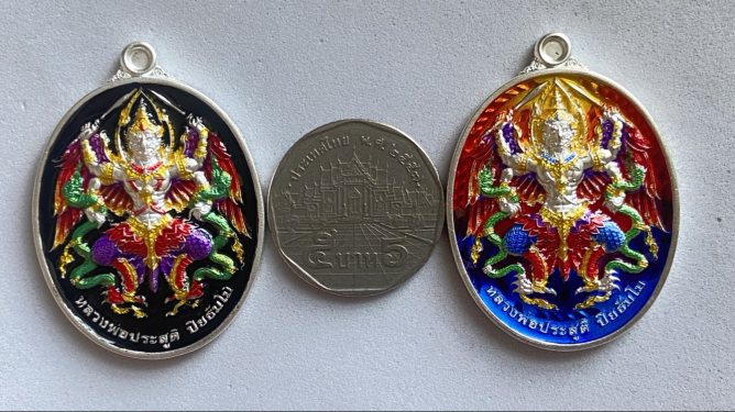 วัดใจเคาะเดียวแดงจ้า เหรียญครุฑยุดนาค รุ่นแรก หลวงพ่อประสูติ เนื้อชุบเงินลงยาดำ+ช ุบเงินลงยาไล่สี หลังพญาเสือนอนกิน เคาะเดียวแดงจ้า