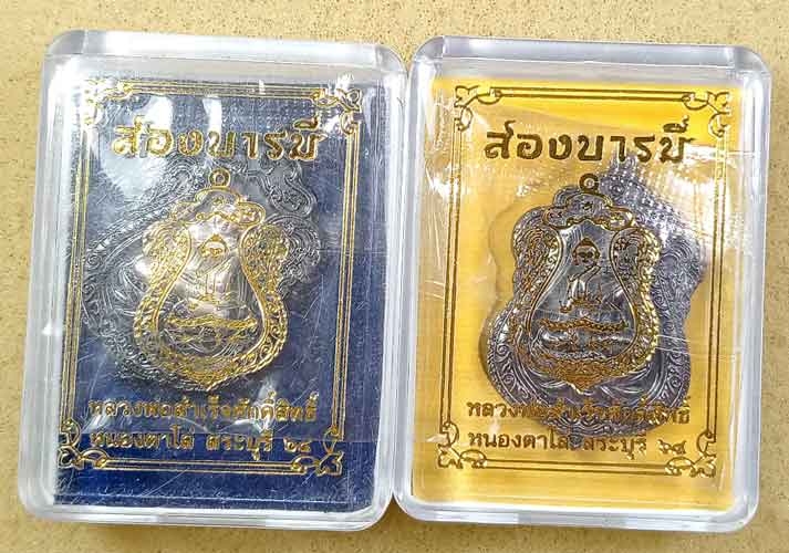 เหรียญ รุ่น สองบารมี หลวงพ่อสำเร็จศักดิ์สิทธิ์ เนื้อนวะหน้ากากเงิน + เนื้อทองแดงรมดำ จ.สระบุรี กล่องเดิม