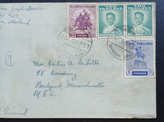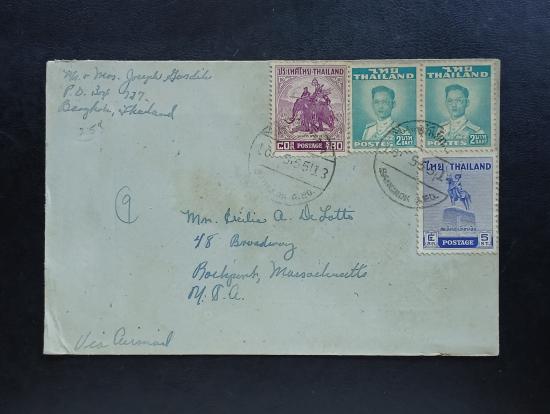 ซองจดหมาย ลายมือ ปี 2498 (1955) BANGKOK-U.S.A. ติดแสตมป์พระรูป ร.9 Thailand ปี 2494 มี pair ติดกัน 2 ดวง, พระเจ้าตากสิน ปี 2498, พระนเรศวร ปี 2498 มีตราประทับ ไปรษณีย์กลาง 1955
