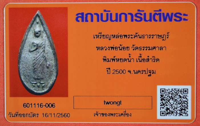 เหรียญหล่อพระคันธาราษฎร์ หลวงพ่อน้อย วัดธรรมศาลา พิมพ์หยดน้ำ เนื้อสำริดดำหรือเนื้อนวโลหะดำ หน้าตาชัดๆ ปี 2500 จ.นครปฐม พร้อมบัตรรับรอง เคาะเดียวแดง |