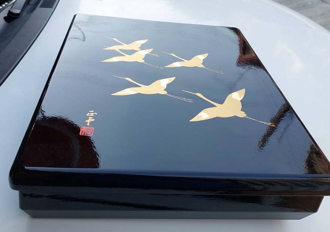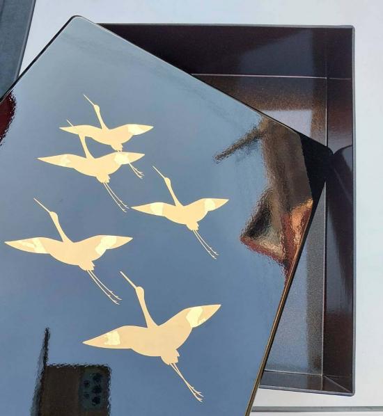 กล่องไม้เครื่องเขินญี่ปุ่น (Japanese lacquerware) ประเภทวาจิมะ-นูริ (Wajima-nuri) ลายนกเรียนทองคำ ซึ่งมีชื่อเสียงในด้านความทนทานเป็นพิเศษ ขนาด13*11นิ้ว หนา 3 นิ้ว