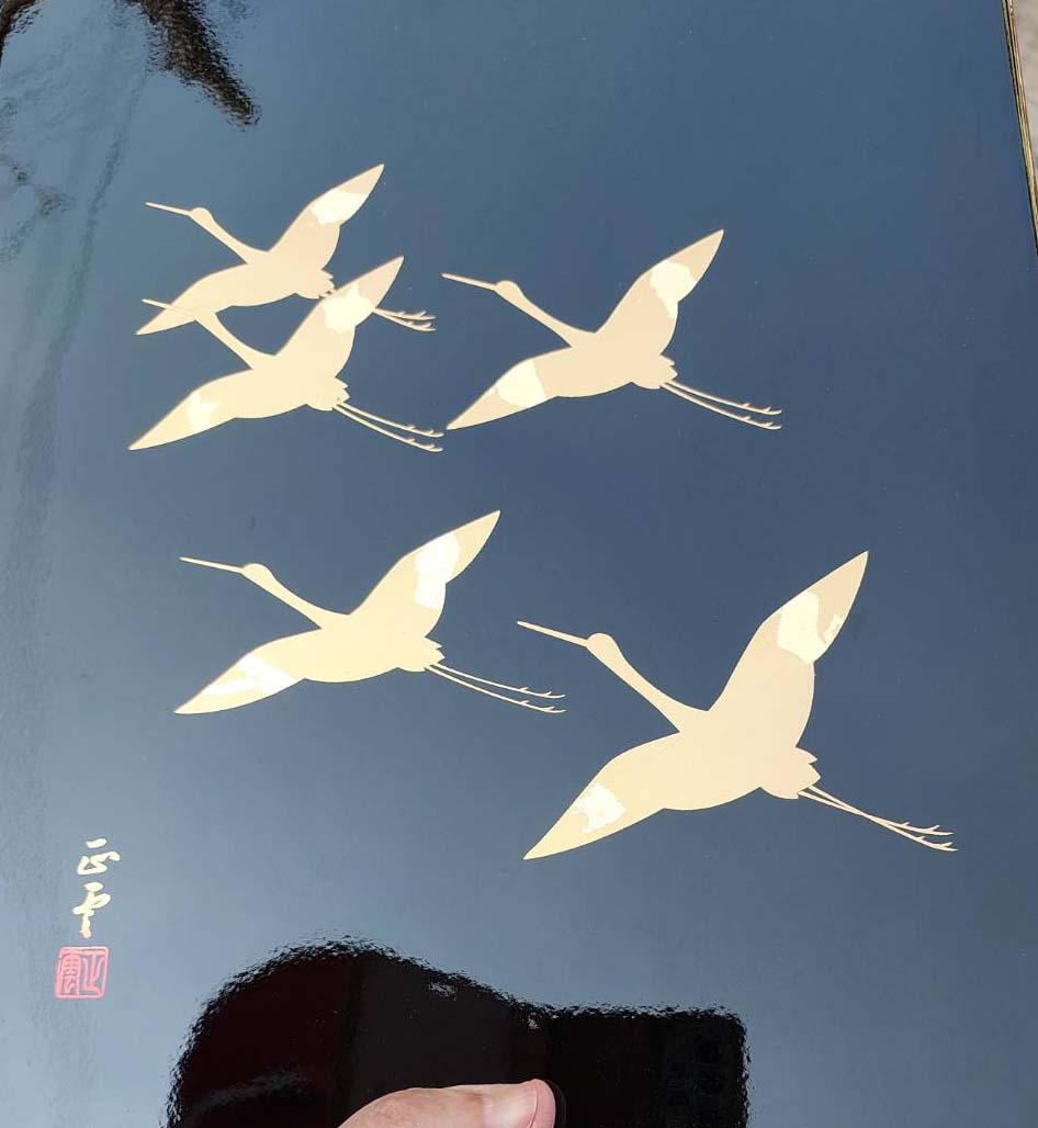 ลวดลายเครนสีทองบนพื้นหลังสีดำเป็นเทคนิคการตกแต่งแบบดั้งเดิม