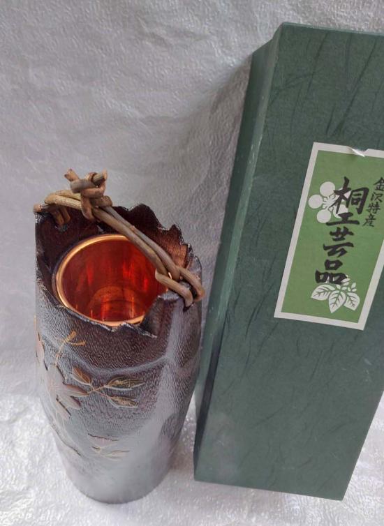 แจกันไม้ธรรมชาติ ต้นจักรพรรดินี (Empress Tree) เป็นงานฝีมือจากคานาซาวะ เพ็นลายทอง หูร้อยด้วยหวาย สวยๆ สูง 13 นิ้ว กว้าง 5 นิ้ว