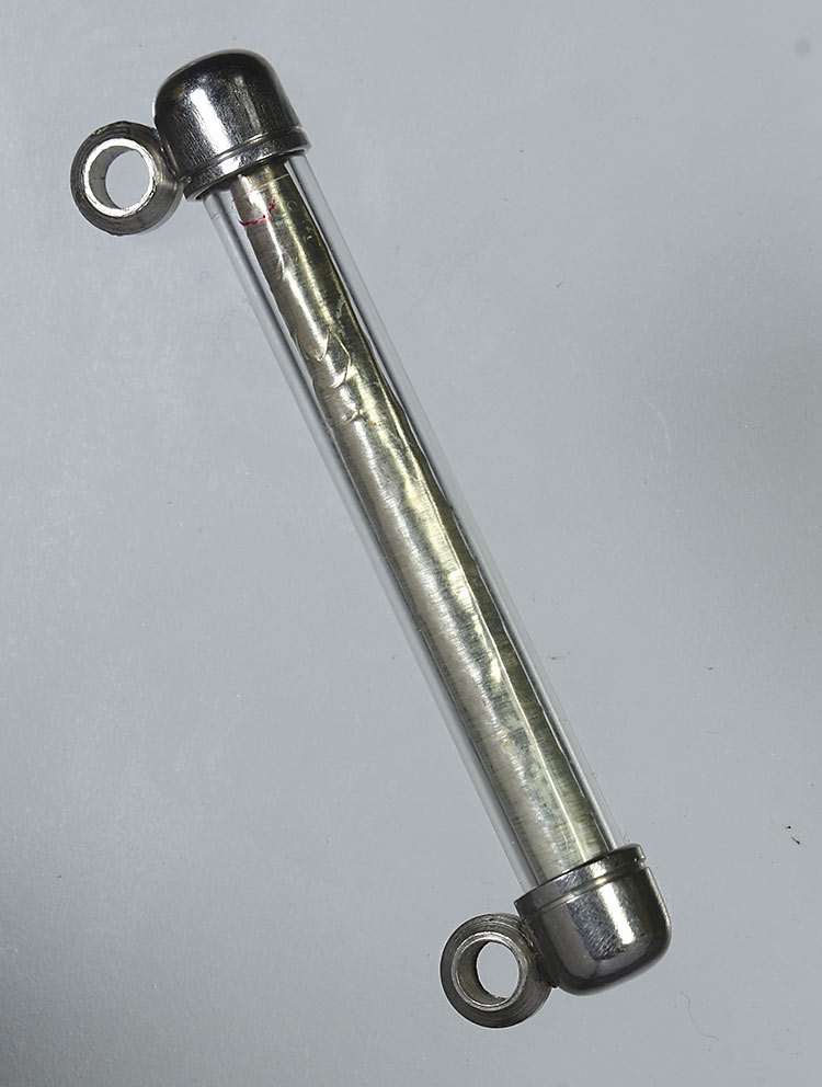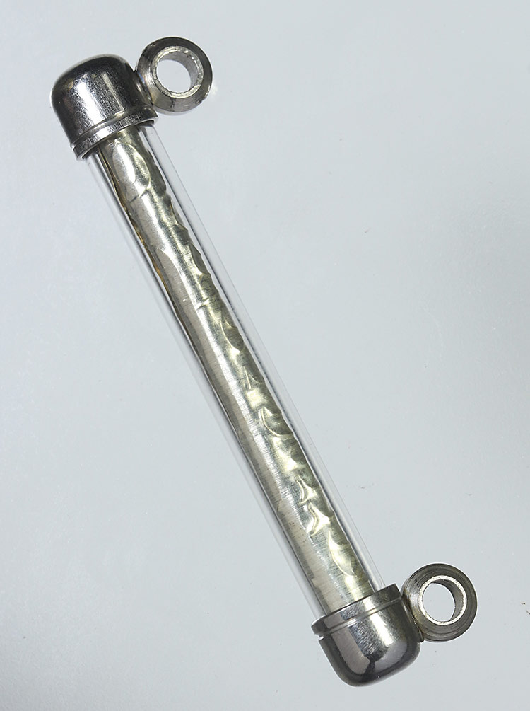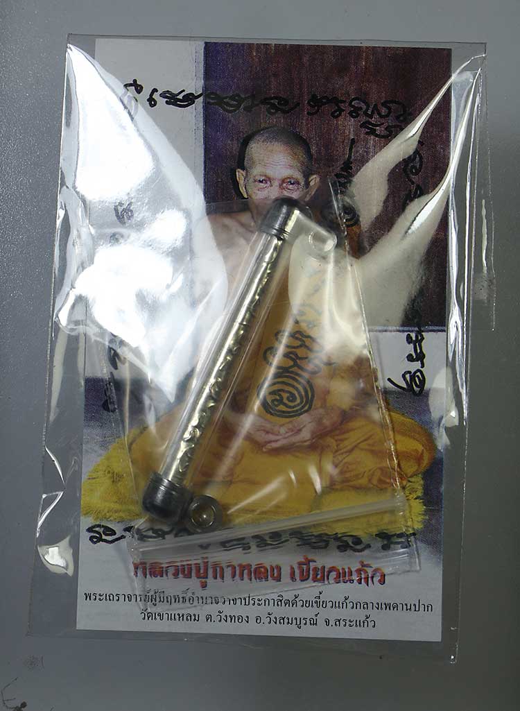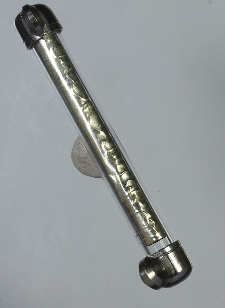 วัดใจ**เครื่องราง ตะกรุดปลดหนี้หรือตะกรุดกันผี กันคุณไสย แผ่นเงิน จารยันต์ด้วยมือ หลวงปู่กาหลง เขี้ยวแก้ว ความยาว 4 ซม. ใส่หลอด...พร้อมซองเดิมๆครับ