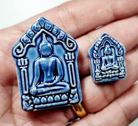 พระขุนแผนแก้วมณีโชติ(แก้วสารพัดนึก) เซรามิกเคลือบ โรยพลอย เนื้อเคลือบฟ้า วัดโพธิ์แก้วประสิทธิ์ จ. กระบี่ ปี ๒๕๕๘ เซรามิกเคลือบสร้าง ๓ สี ฟ้า เขียว และ เหลือง สร้างสีละ ๔๙๙ ชุดๆละ ๒ องค์ ผสมมวลสารพรายกัญญา พุทธศิลป์งดงามมาก พุทธคุณล้ำเลิศครับ |
