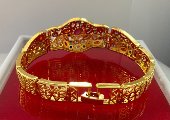 หน้ากำไลหนาขนาด2.5cm เส้นข้างกำไลหนา10m สวยๆใส่เพื่อเสริมความปัง ความรวย ตัวเรือนเป็นงานจิวเวลลี่ฝังบาล้อก ชุบเศษทองแท้ สวมใส่ได้ทั้งชายและหญิง.รูปแบบสั่งทำไม่มีเกร่อ งานขึ้นตู้ขึ้นห้าง ใส่แล้วดูดีไม่มีใครมีเหมือนแน่นอน