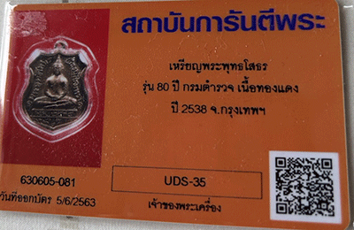 เหรียญพระพุทธโสธร รุ่น 80 ปี กรมตำรวจ เนื้อทองแดง ปี 2538 กรุงเทพฯ พร้อมบัตรรับรองรับ