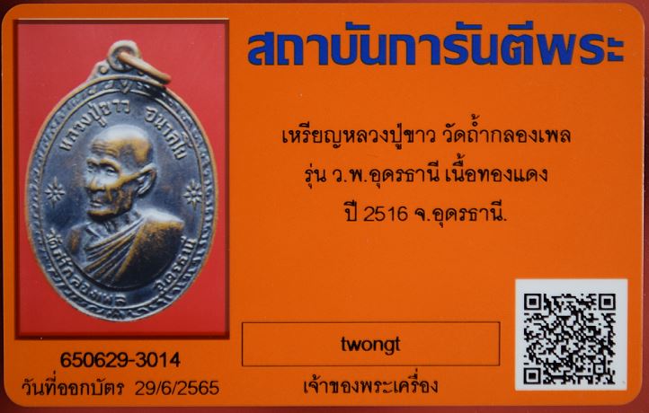 เหรียญหลวงปู่ขาว วัดถ้ำกลองเพล รุ่น ว.พ. อุดรธานี เนื้อทองแดงรมดำ ปี 2516 จ.อุดรธานี พร้อมบัตรรับรอง เคาะเดียวแดง