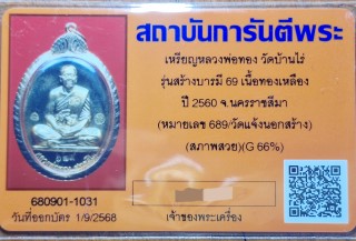 วัดใจ เหรียญหลวงพ่อทอง วัดบ้านไร่ รุ่นสร้างบารมี 69 เนื้อทองเหลือง ปี2560 จ.นครราชสีมา พร้อมเลี่ยมกันน้ำ (ไม่มีทองแล้ว) |