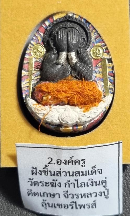- รก.2 องค์ครู ฝังชิ้นส่วนสมเด็จวัดระฆัง กำไลเงินคู่ ตะกรุดทอง ติดเกศา จีวรหลวงปู่