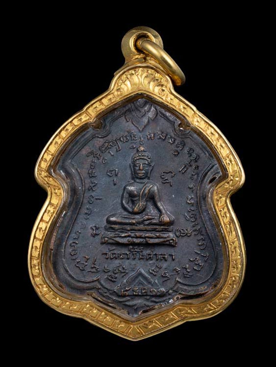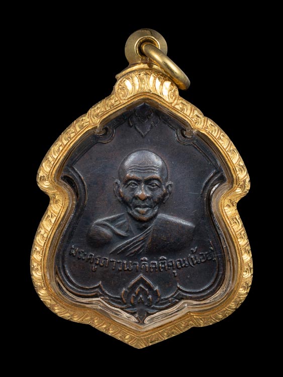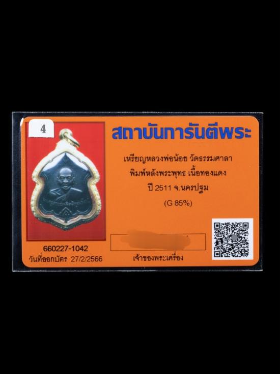 เหรียญหลวงพ่อน้อย วัดธรรมศาลา พิมพ์หลังพระพุทธ ปี2511 เลี่ยมทอง 85% พร้อมบัตรรับรอง