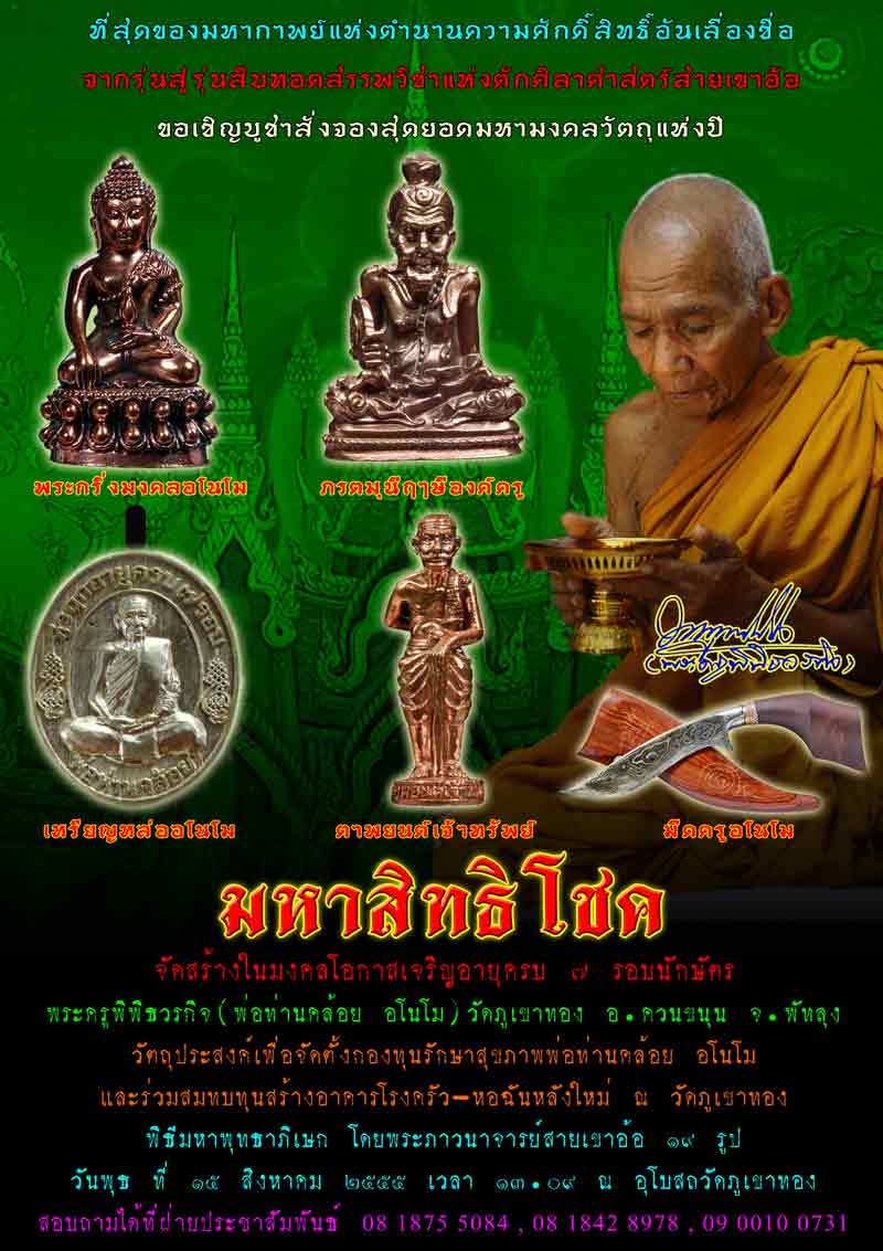พิธีมหาพุทธาภิเษก โดยพระภาวนาจารย์สายเขาอ้อ 19 รูป วันพุธ ที่ 15 สิงหาคม 2555 เวลา 13.09 น. ณ อุโบสถวัดภูเขาทอง